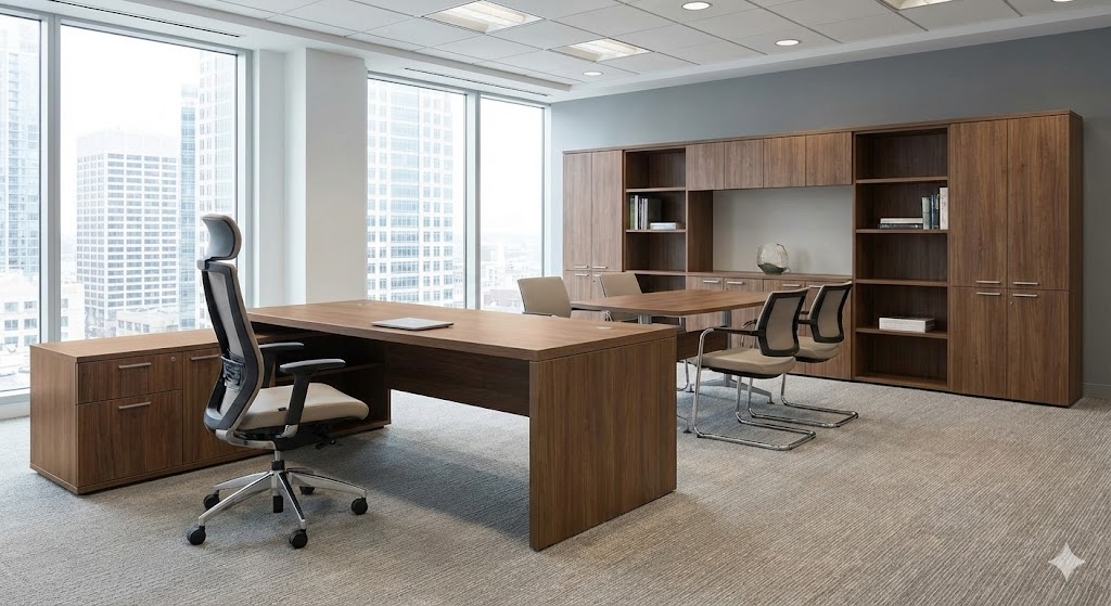 Maxconcept was commissioned to furnish a new executive suite for a corporate client. The goal was to create a professional environment that balances individual productivity with collaborative needs. We designed and manufactured a large executive desk with integrated cable management and storage. Complementing this is a custom-sized meeting table.