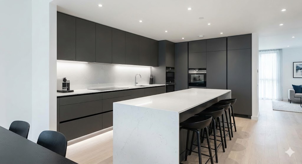Designed for a client who loves to entertain, this “Grand Kitchen” features floor-to-ceiling cabinetry and a massive double-island layout. We utilized premium moisture-resistant materials and heavy-duty hardware to support the large storage requirements. The design seamlessly integrates professional-grade appliances with our custom factory-finished wood joinery.